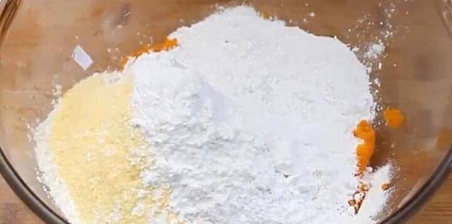 4、把胡蘿卜泥倒進一個大碗裡,加入150克普通面粉、50克玉米面粉、50克糯米粉,揉成面團。