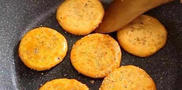 9、在平底鍋裡刷一層油,開小火,把做好的餅胚放進去,煎至餅胚兩面金黃熟透即可。