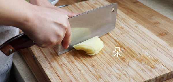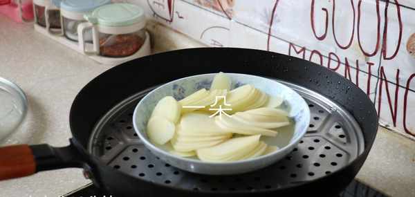 2,土豆去皮切成薄片,上鍋蒸熟,大約需要10分鐘