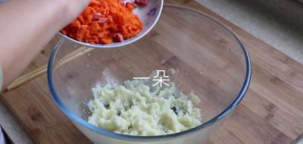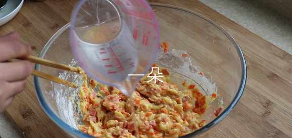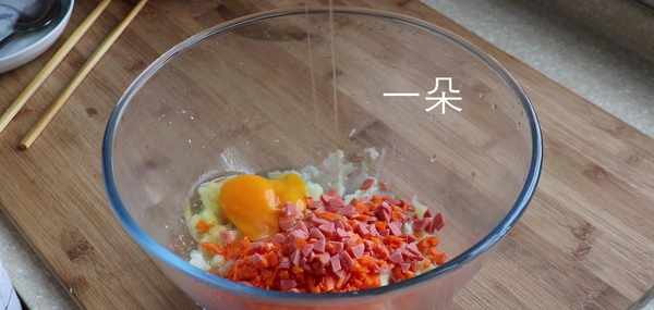 5,搗成泥之後再將胡蘿卜和香腸放進去,在裡面打2個土雞蛋,放少許鹽和胡椒粉攪勻