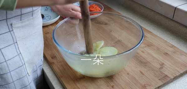 4,蒸好的土豆拿出來用搟面杖搗成泥