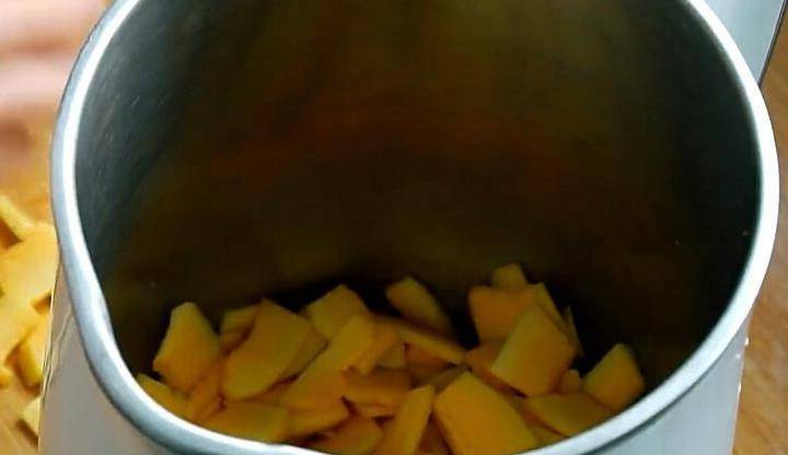 1、把南瓜洗凈,去皮去瓤,然後再把南瓜切成小片,放進豆漿機裡面(切成小片更容易打成細膩的汁)。