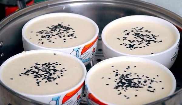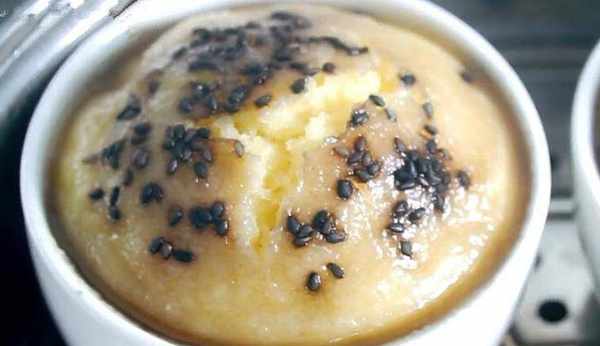 6、準備幾個小碗,給每個碗裡都刷一層油(這樣在最後脫模的時候才會好操作),再把打好的米糊都盛滿每個小碗,再在每個小碗上面撒上一些黑芝麻。