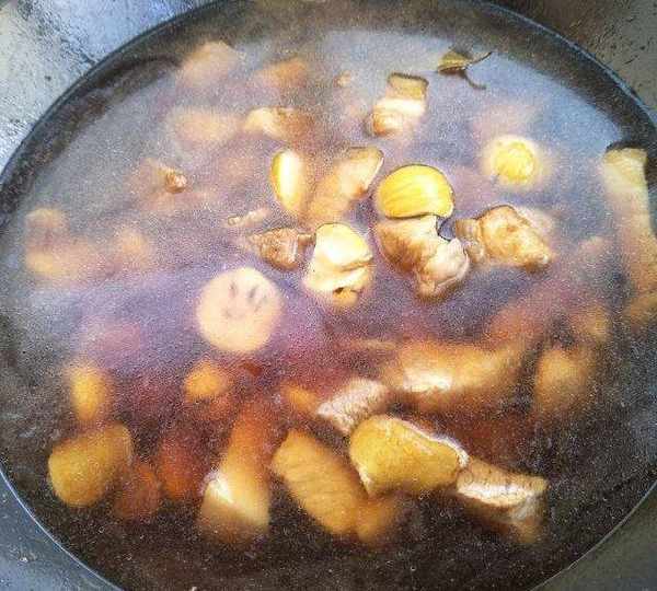 第5步、倒入少許花雕酒翻炒幾下,按個人口味倒入適量老抽、生抽加入冰糖、栗子,一次性把水加足,大火燒開轉中小火燉45分鐘。