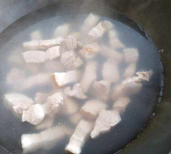 第3步、五花肉熱水中焯水,撈出控水備用。