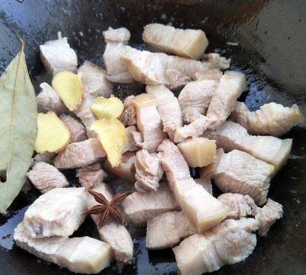 第4步、不粘鍋把鍋燒熱可以直接放入五花肉小火煸炒出油,加入薑片、蒜、八角、香葉翻炒幾下。如果是鐵鍋可以加少許花生油,以免粘鍋。