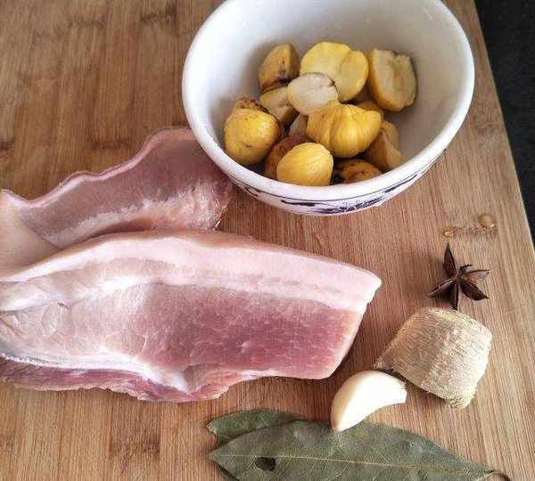 原料:帶皮五花肉、栗子、薑、蒜、八角、香葉、老抽、生抽、花生油、花雕酒、冰糖。