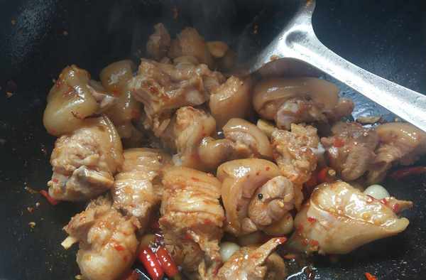 炒菜鍋洗幹凈擦幹水分,倒入適量的食用油燒熱,油熱後倒入蒜薑辣椒炒出味,接著放入一大勺豆瓣醬,豆瓣醬可以根據你今天做的豬蹄的分量多加一點。豆瓣醬炒香後加入一點醪糟酒、冰糖或者白糖繼續炒,炒一分鐘後倒入今天的主角豬蹄。迅速翻炒,可以看到豬蹄變色,然後加入一點醬油、料酒,可以根據你之前加入的調味看需不需要加入一點鹽,我辣椒用的自己泡的,媽媽做的豆瓣醬相對比較有味又加入瞭一點醬油,所以我沒有加鹽。加入醬油一是為瞭讓豬蹄更入味,二是讓豬蹄更好看,你也可以加入老抽,這樣顏色更加好看。調味料加得差不多後,繼續翻炒豬蹄,現在可以不用迅速翻炒,隻需要保證不沾鍋就行,這一步是為瞭讓豬蹄裡面的油爆點出來,吃起來沒有那麼油膩,口感也更加美味。