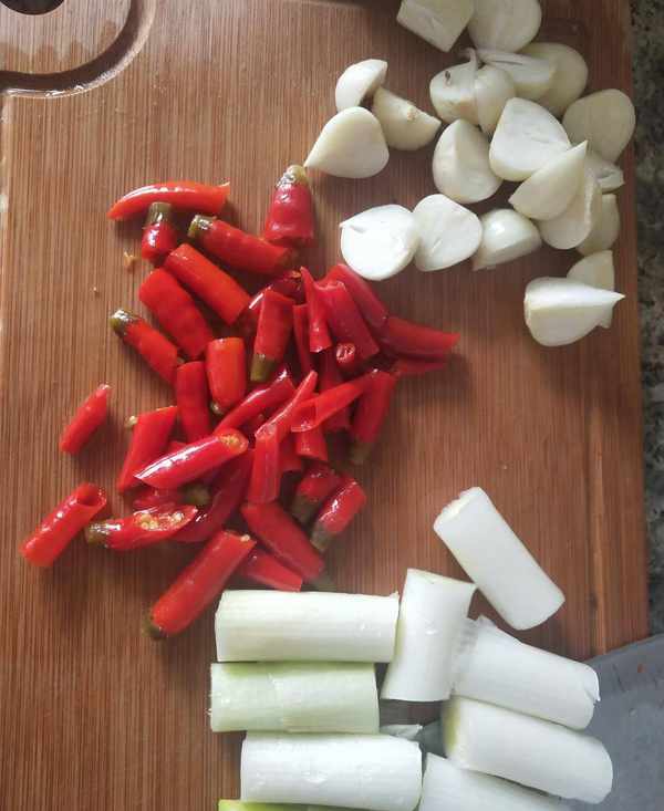 大蔥切成段,蒜切成瓣,辣椒切成段,薑切成片,我今天做的豬蹄是沒有加其他什麼配菜的,平時我們在傢做菜是不會放八角山奈這些的,如果你喜歡這個口味的話,可以加一點八角山奈。