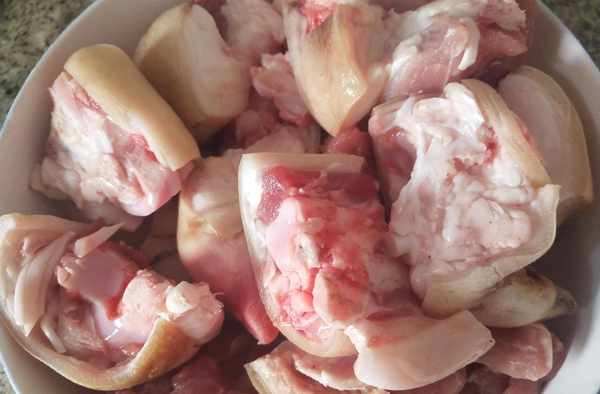 豬蹄是在菜市場買的,傢裡沒有專用剁刀,所以麻煩市場老板把豬蹄剁成一坨一坨的。如果你傢裡有能剁動的刀,並且有相應的力氣的話,個人建議你買瞭豬蹄回傢處理後再剁成坨,這個可以更加衛生一點。我們這麼食材裡的豬蹄都是對半切開的,所以上面那圈肥的也在一起,你購買豬蹄的話,如果能隻購買蹄尖那一塊是最後的,我是覺得,豬蹄不管怎麼做,最好吃的都是蹄尖。
