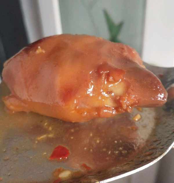 然後放入大蔥,一點味精,大火收汁,起鍋裝盤。一道美味酥軟的紅燒豬蹄就完成瞭,看看我做的紅燒豬蹄,有沒有讓你口水留下來。