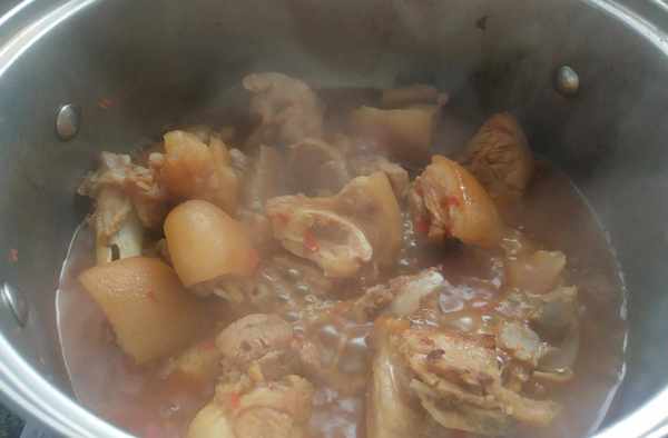 豬蹄炒的差不多後,倒入蓋過豬蹄的水,可以多加一點。蓋上鍋蓋,大火燒開,然後小火慢燉一個小時以上,這樣才能讓豬蹄軟,骨頭好啃。我傢裡的炒菜鍋沒有蓋子,所以把豬蹄炒好後,我就乘入小銻鍋裡面來燉煮的。
