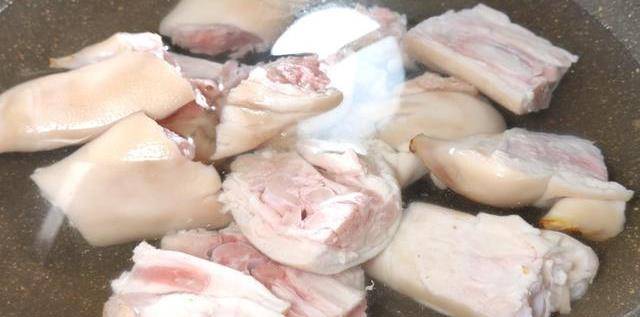3.鍋中入水,下入豬蹄,加入適量的料酒,大火煮五分鐘,煮開撇去浮沫,放到清水中洗幹凈,控幹水分。