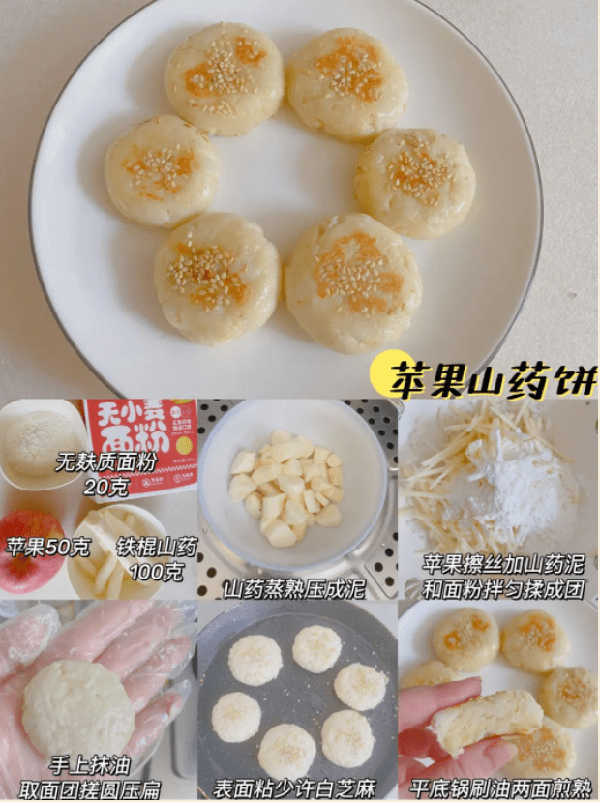 準備食材:鐵棍山藥100克,蘋果50克,嬰享無小麥面粉20克,白芝麻適量