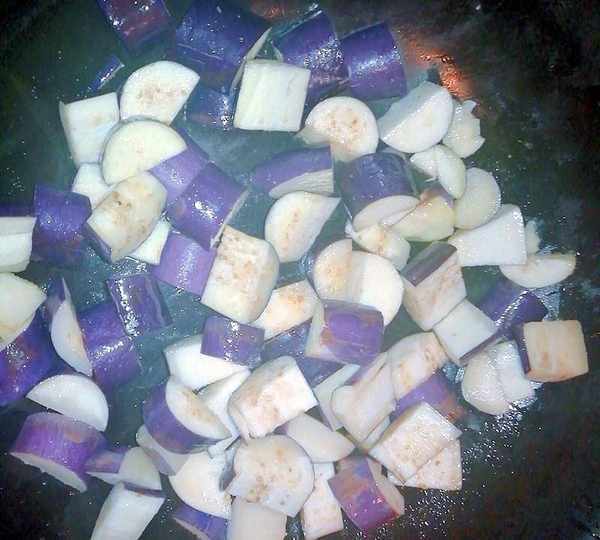 3、另起鍋,下油,加入大蒜、茄子、鹽翻炒。茄子翻炒至七成熟的樣子加入生抽翻炒均勻,再加入炒好的鴨腿肉一起翻炒。熟瞭之後加入雞精出鍋。