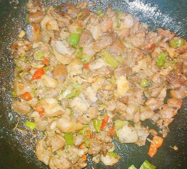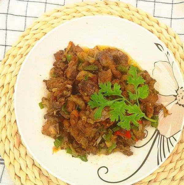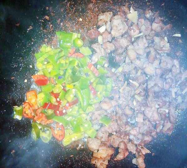 2、熱鍋,不下油,加入鴨腿肉翻炒,炒至出油後,加入生薑、鹽、青椒一起翻炒一會,裝盤待用。