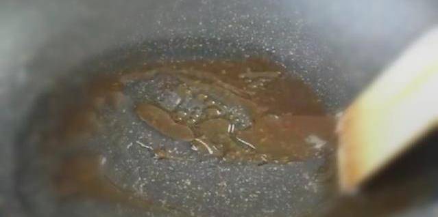 3.鍋中倒入油,放入冰糖,不停攪拌至冰糖融化,再至焦糖色出現。