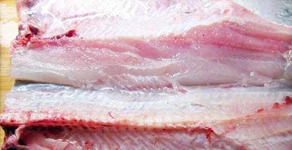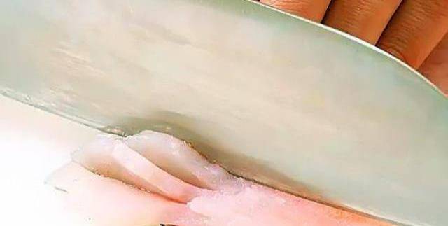 2、魚的另一面的魚肉也用同樣的辦法片下來,然後再把兩大片魚肉上面的肚子部分的魚刺給片下來,片下來的魚骨可以用來煮湯喝。