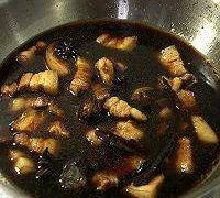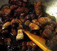 7.炒肉的時候待肉質變得有些焦黃,加入紅燒醬油和料酒,讓顏色均勻覆蓋五花上;