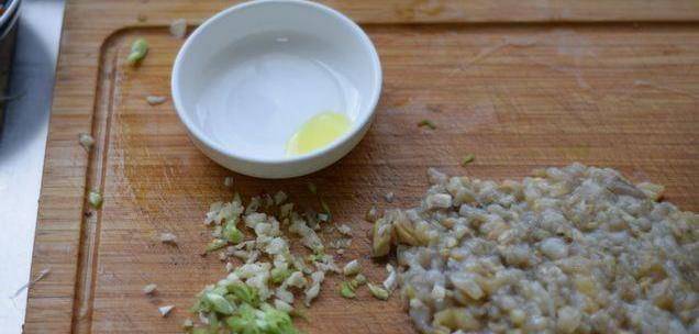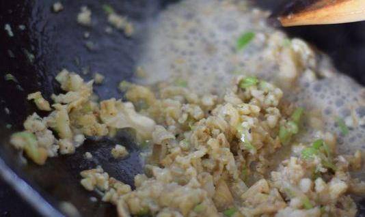 3燒熱鍋,倒入少許油,放入蔥、薑、蒜碎,炒出香味,然後放入剁碎的蛤蜊肉,變色後立即撈出。