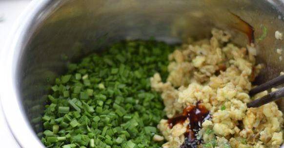 4雞蛋、蛤蜊肉、韭菜放在一起,把所有調味料和拌勻,放餃子時註意鹽等!