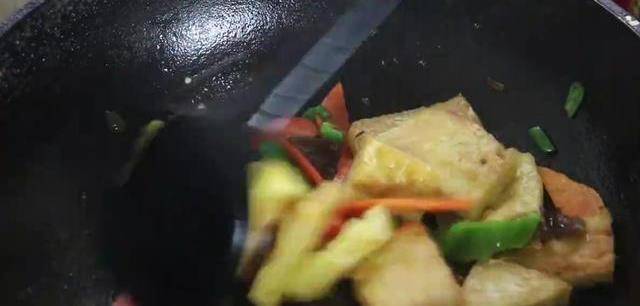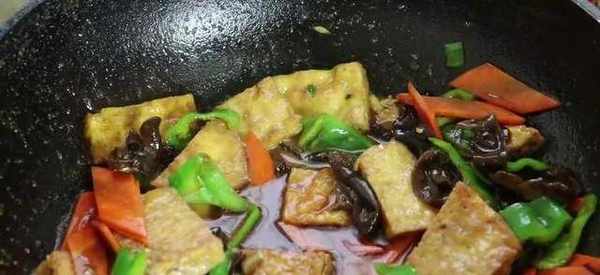 煎至兩面金黃後出鍋備用,另起一鍋加入食用油,油炸後下入蔥花爆香。接著加入胡蘿卜、青椒、黑木耳,翻炒均勻。再下入煎好的雞蛋豆腐塊,繼續翻炒。翻炒片後淋入調好的料汁,翻炒入味。最後淋入水淀粉,翻炒至湯汁變濃稠。