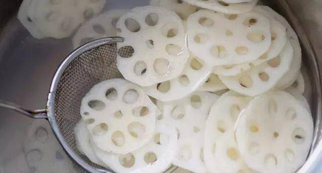 藕削皮後切成薄片,把藕片倒進開水鍋裡快速焯燙到斷生,撈出用清水沖洗一遍,撈出控水。