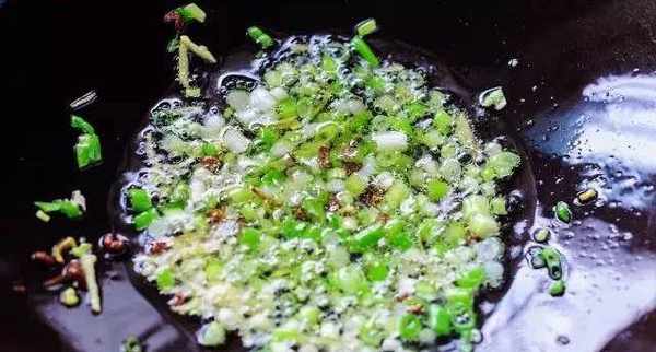 鍋裡倒進油,放進薑末和蔥末炒成蔥油。
