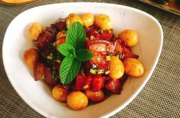 材料:五花肉500g,鵪鶉蛋10個,冰糖20g,蔥、薑適量。