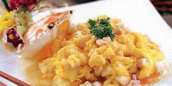 3.鍋中再放油燒熱,下薑末爆香,放紹酒、香醋、味精,倒入蛋清和蛋黃,炒至水汽漸幹,蛋上發亮即成。