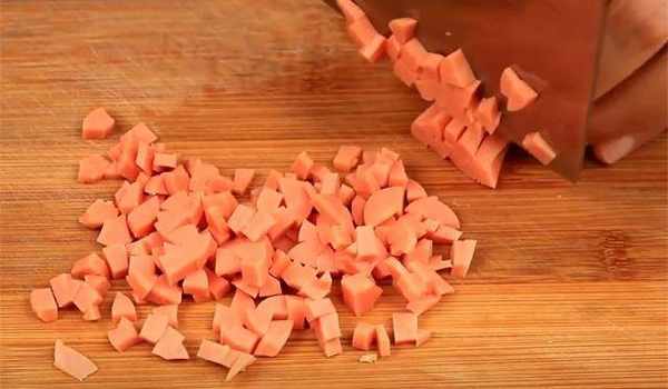 4.一根素火腿腸切成小丁。
