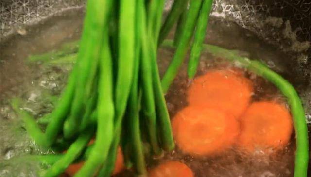 1.鍋裡水開後加一點食用油,加食用油的作用是能使豆角更加的翠綠鮮亮,胡蘿卜也放進去燙一下,都燙熟後出鍋。