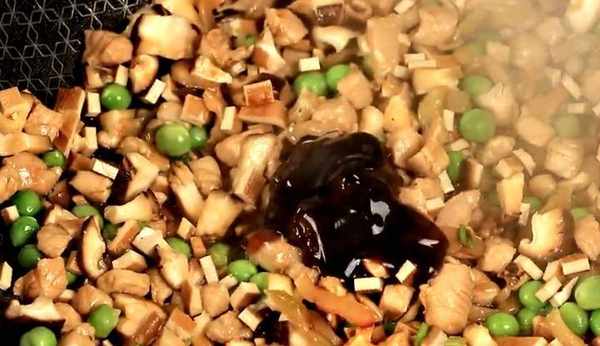 3:起鍋燒油,加上蔥花炒出香味,再加上肉丁炒到變色加上青豆、香幹、榨菜、香菇翻炒均勻,再加上一勺黃豆醬、生抽、蠔油翻拌均勻,加上清水,開小火燜煮10分鐘。