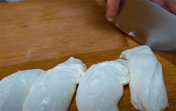 2.面團餳好之後,案板上抹油,不用揉,扯成長條,再切成小面劑。