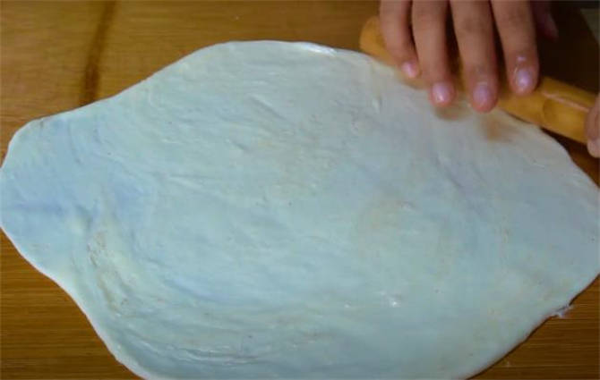 4.上面抹一層油酥,半徑處劃一刀,然後卷起來。
