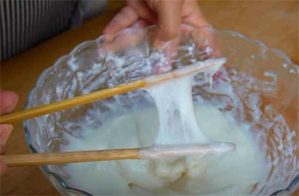 1.準備100g的糯米粉,320毫升的開水燙面,攪拌成細膩無顆粒的面糊,加上20g的食用油,把油和糯米粉攪勻,一直攪拌成輕輕一扯,有拉絲的狀態就可以瞭。