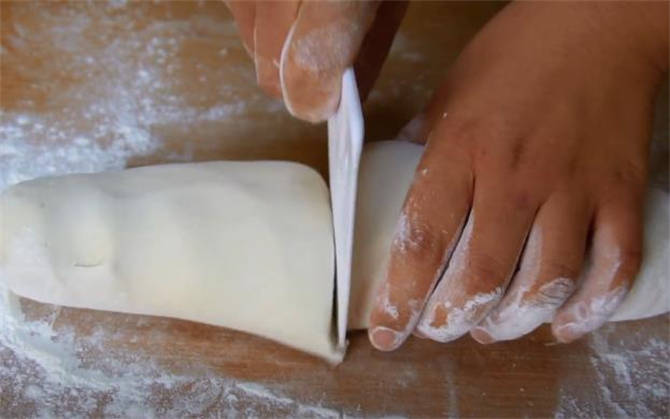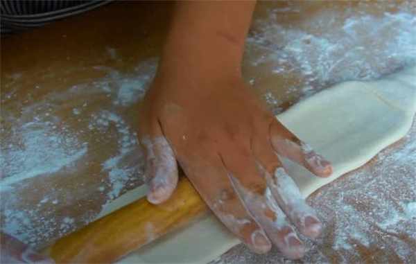 4.再揉成長條按扁,用搟面杖把這個糯米面團搟薄一些。