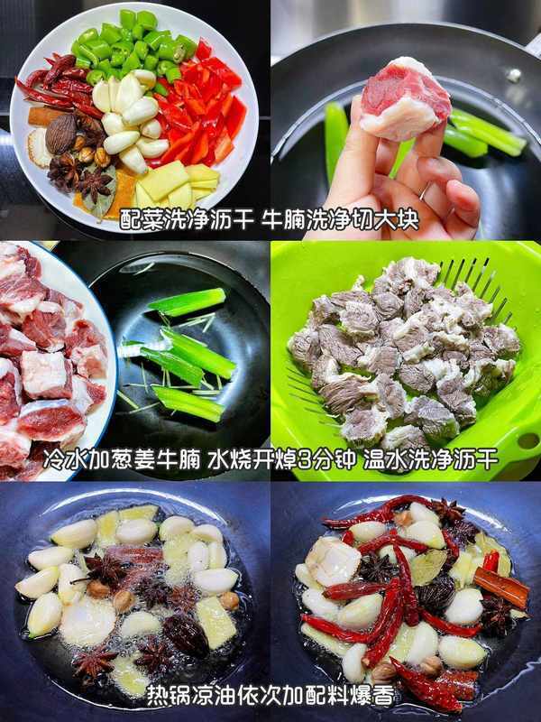 牛腩、薑片、整蒜、桂皮、八角、幹辣椒、香葉、草果、白豆蔻、陳皮、青紅椒。