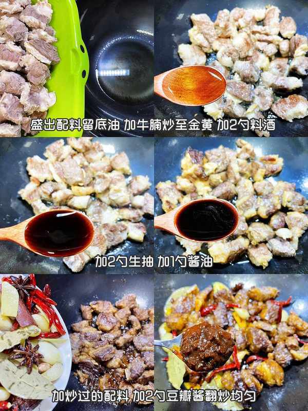 2.加牛腩炒至金黃加2勺料酒+2勺生抽 +1勺醬油+炒過的配料+2勺豆瓣醬,炒上色炒香,加大碗熱水,煮沸加小勺鹽+半勺胡椒粉+陳皮。