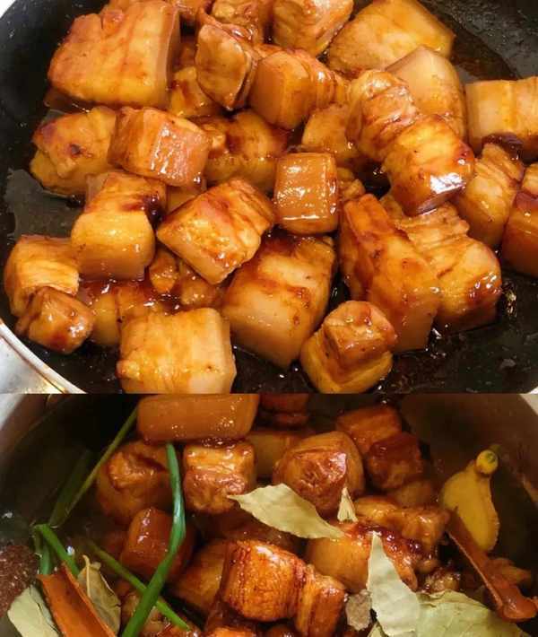 準備材料:肥瘦相間的五花肉500g、冰糖、料酒、生抽、老抽、紅腐乳汁、薑片、蔥段、桂皮、八角、山楂片、香葉