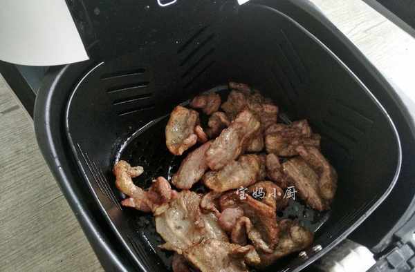 5 空氣炸鍋200度預熱,放入五花肉烤15-18分鐘,喜歡肥的就少烤一會,中途翻面,喜辣的可以再撒點辣椒面。(沒有炸鍋的用電餅鐺或烤箱)