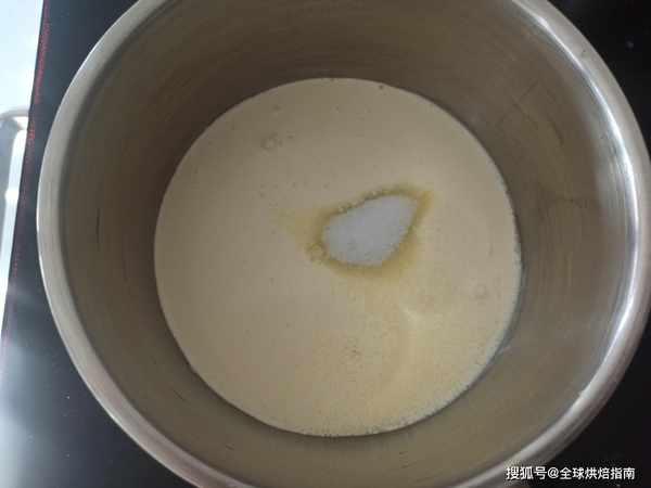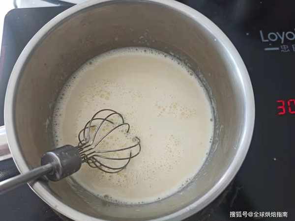▶step012:煮沸的忌廉分次倒入蛋黃糊中,邊倒邊攪,再回鍋熬至濃稠。