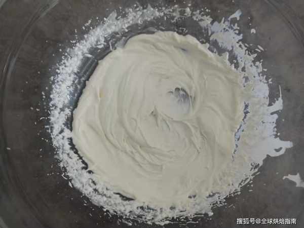 ▶step04:打好的蛋白霜分次加入蛋黃糊中翻拌均勻。