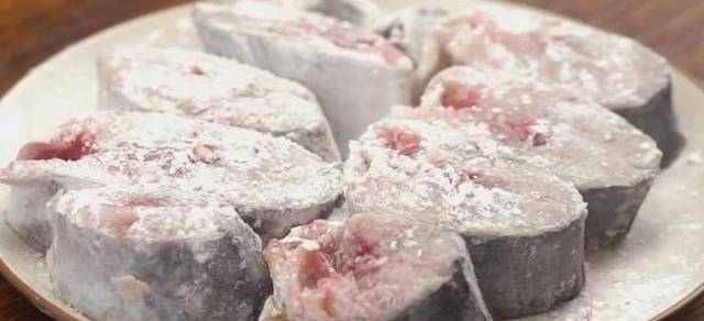 盤子內倒入適量淀粉,把醃制好的魚塊放入淀粉內,均勻的包裹上一層淀粉。掛漿的作用是使肉類食品吃時鮮嫩可口、色澤晶亮。但淀粉的用量要適當,淀粉過多,看上去黏糊糊的,吃口也不好;淀粉過少,有起不瞭掛漿的作用。
