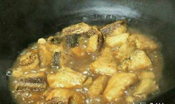 4.接著倒入啤酒,大火燒開,放入炸至好的魚塊。放入鹽,雞粉和白糖調味,改小火燜至5分鐘左右。