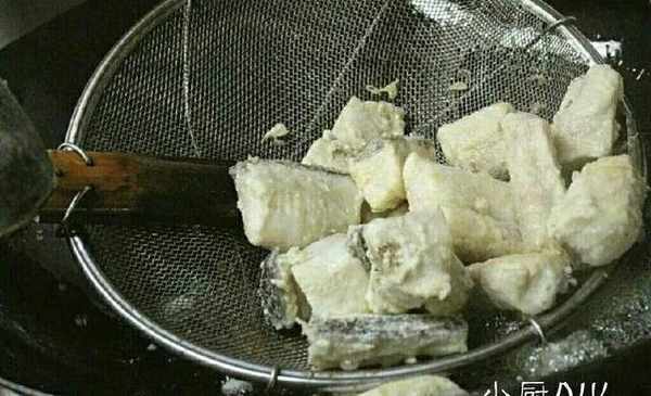 2.將鍋清洗幹凈,燒熱倒入食用油,燒至7成時。把醃制好的魚塊放入,炸至定型後,改小火炸制熟透。撈出,待油溫升高時,再放入炸至表皮金黃,倒出控油待用。