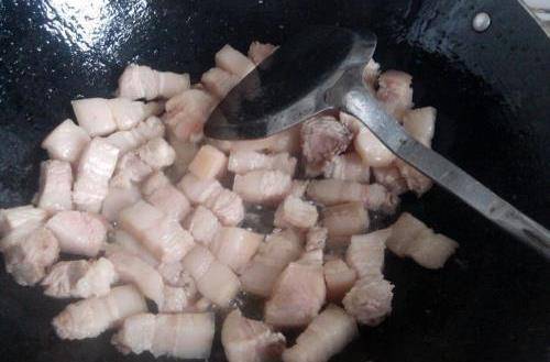 把選好的五花肉洗幹凈切成麻將塊兒,然後放到鍋中焯水,在焯水的過程中,我們除瞭要放蔥和薑片以外,還要放入半杯白酒,白酒可以很好的幫助豬肉去腥,等到鍋裡的五花肉腥味你沒瞭,就為沒瞭,焯制過程就完成瞭,把炒好的豬肉撈出來放到盤中。