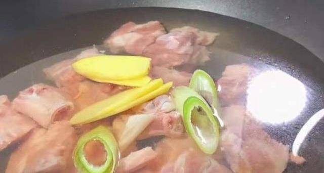2、排骨涼水下鍋,然後再放入薑蔥、料酒去腥,開大火煮開。水開後再打去上面的浮沫。煮個一兩分鐘就可以瞭,撈出來控幹水分。