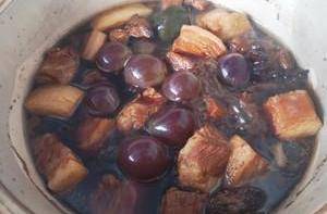 帶皮五花肉2斤啤酒2罐老1勺生3勺蔥1根幹薑6~8片冰糖30~50克八角桂皮1片香葉3~4片葡萄(酸甜水果)6~8粒料酒1勺。
