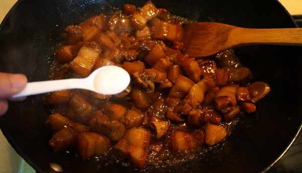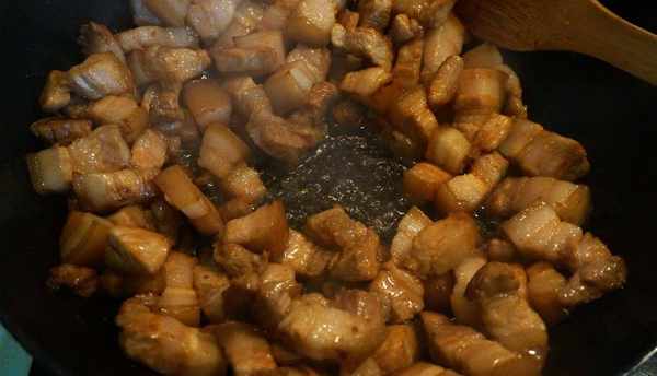 5.將肉塊入鍋中,不停地翻炒,讓每塊肉都能沾上糖色,直到肉塊變硬,裡面的多餘油脂炒出來;